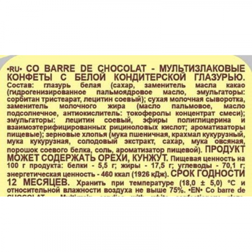 Мультизлаковые конфеты с белой кондитерской глазурью. Состав: глазурь белая (сахар, заменитель масла какао (гидрогенизированное пальмоядровое масло, эмульгаторы: сорбитан тристеарат, лецитин соевый); сухая молочная сыворотка, заменитель молочного жира (масло пальмовое, масло подсолнечное, антиокислитель: токоферолы концентрат смеси); эмульгаторы: лецитин соевый, эфиры полиглицерина и взаимоэтерифицированных рициноловых кислот; ароматизаторы пищевые); зерновые хлопья (мука пшеничная, крахмал кукурузный, мука кукурузная, солодовый экстракт, сахар, мука овсяная, порошок соевого белка, соль, ароматизатор пищевой). Пищевая ценность на 100 г продукта: белки - 5,5 г; жиры - 17,5 г; углеводы - 70,1 г. Энергетическая ценность: 460 ккал (1926 кДж). Срок годности: 12 месяцев. Хранить при температуре 18+5°С и относительной влажности воздуха не выше 75%. Масса нетто: 1000 г. Страна происхождения: Россия.